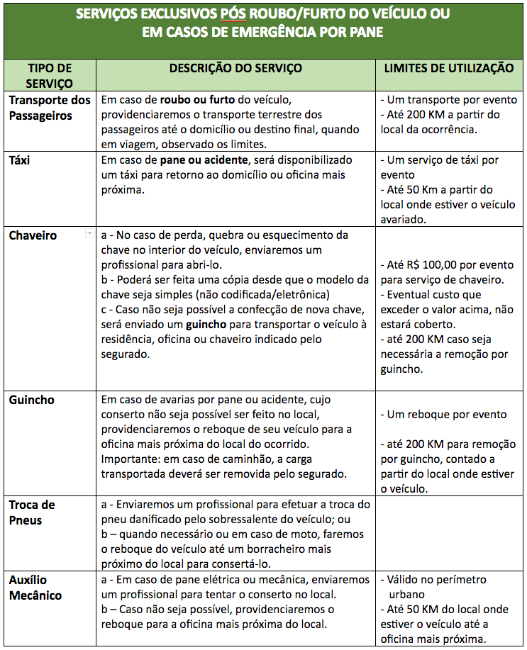 Os Serviços disponíveis para emergência são os abaixo e cada um poderá ser utilizado até 3 vezes durante a vigência anual do seguro, em todo Brasil:
